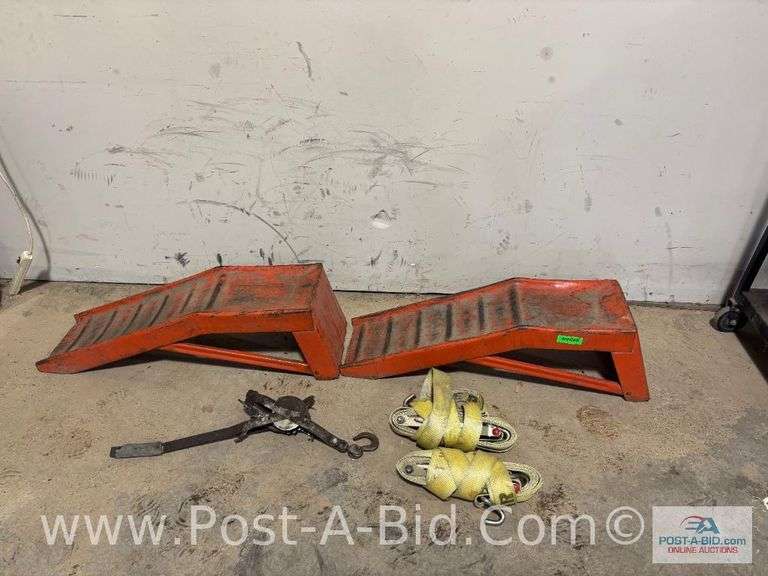 2-Heavy Duty Ratchet Straps, Pair Of Ramps And Come-A-Long.